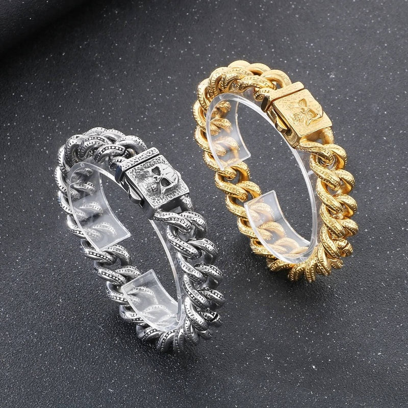 15mm Vintage Cuban Chain Bracelet With Skull Charm Clasp