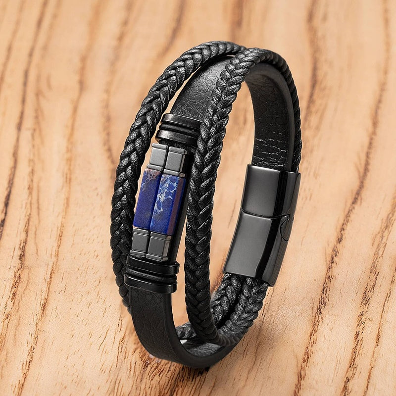 Men's black leather bracelet with green jade beads and magnetic clasp. Multi-layer design for casual style. Durable, elegant jewelry. Shop now! (136 characters)